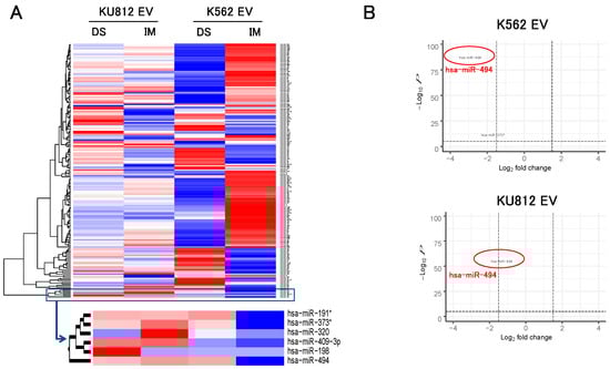 MiRNA microarray analysis in EV from two cell lines. (A) Heatmap and hierarchical clustering after TKIs treatments. Red or blue color indicate increased or decreased miRNA in EVs after TKIs treatment, respectively. Six miRNAs were clustered as the independent group. (IM: imatinib, DS: dasatinib) (B) Volcano plots from miRNA microarray analysis of two cell lines. For drawing volcano plots, the integrated data from both TKIs was used to detect commonly fluctuating miRNAs.