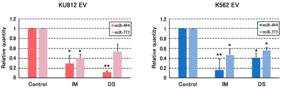 In K562-derived EVs, the relative levels of miR-494 were 0.16 (IM, p < 0.01) and 0.41-fold (DS, p < 0.05) in comparison with non-treated cultures, and that of miR-373-5p was 0.47 (IM, p < 0.05) and 0.56 (DS, p < 0.05) folds. As for KU812 cells, the relative levels of miR-494 were 0.29 (IM, p < 0.05) and 0.11 (DS, p < 0.01) folds, and that of miR-373-5p were 0.41 (IM, p < 0.05) and 0.53 (DS, p > 0.05) folds (Figure 3). In both cell lines, the quantity of the two miRNAs in EVs were significantly decreased.