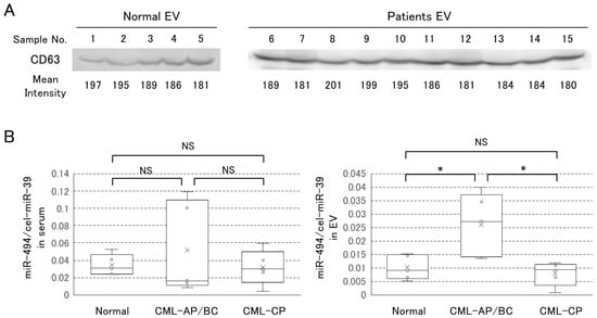 The analysis of EV in serum. (A) The EVs from serum were recovered by ExoQuick® reagent and quantified by western blotting of CD63 protein. Sample number indicate; 1–5 (Normal), 6–10 (CML-AP/BC), 11–15 (CML-CP). The mean intensity of each band is shown below the bands. (B) qRT-PCR analysis of miR-494. The black line in each box plot indicates the median. The lower and upper edges of the box indicate the 25% and 75% distribution percentiles, respectively. (B) shows in whole serum (left panel) and in only EVs (right panel). Asterisks indicate statistical significance and NS means “Not Significant” (* p < 0.05).