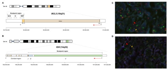 Schematic representation of the IGH::BCL2 translocation breakpoints in follicular lymphoma. (A) The figure shows the BCL2 locus, containing two exons and one intron located in 18q21 and annotated based on ENST00000398117.1 (hg19). The arrow indicates the direction of BCL2 transcription. The breakpoints cluster in three main regions located at 3′ of BCL2, namely major breakpoint region (MBR), intermediate cluster region (ICR), and minor cluster region (MCR). Breakpoints located at 5′ of BCL2 locus have also been described, mainly when BCL2 is rearranged with the light chain loci on 2p12 and 22q11. (B) The panel illustrates the IGH locus, representing the constant region (yellow color and highlighted in light gray), the V (green), D (blue), and J (red) regions. The arrow shows the direction of IGH transcription. The distribution of the various breakpoints regions is displayed in the upper part, involving V(D)J region. (C,D) Fluorescence in situ hybridization of paraffin-embedded tumor sections using the dual color, dual fusion IGH::BCL2 (C) and dual color, break-apart BCL2 (D) probes. (C) FISH analysis shows two yellow signals (yellow arrow), indicating an IGH::BCL2 fusion and one green (green arrow) and one red signal (red arrow) corresponding to unrearranged IGH and BCL2, respectively. Normal cells display two green signals and two red signals. (D) Signal constellation shows a break in the BCL2 locus indicated by a split of the yellow signal into one green and one red and unrearranged BCL2 labeled with a yellow signal. Normal cells have two yellow signals.