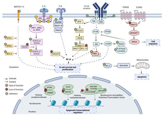 Molecular pathways involved in follicular lymphoma. The figure shows the several pathways dysregulated in follicular lymphoma. Gain-of-function alterations are labeled with a green star, loss-of-function with a red star, and unknown functions with a grey star. BCL2 overexpression leads to apoptosis inhibition. Genomic alterations affecting Janus Kinase (JAK) signal, B cell receptor (BCR) pathways, MYD88, and NOTCH pathway directly stimulate B cell survival and proliferation. Alterations in sphingosine 1-phosphatase receptor 2 (S1PR2) and guanine nucleotide binding protein subunit (GNA13) enhance dissemination outside the germinal centers. Figure created with BioRender.com (accessed on 13 July 2022).