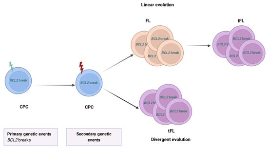 Histological transformation of FL (tFL) into an aggressive lymphoma (mainly diffuse large B cell lymphoma—DLBCL) [94,95,96,97,98] can occur during the course of the disease and affects approximately 10–20% of patients [9,99,100,101]. Several studies have been conducted to describe the genetic landscape of tFL and compare it to baseline biopsy samples. The studies of paired diagnostic and tFL cases identified that tFL arises mainly through a divergent or branching evolution from a common altered precursor cell (CPC) [29,73,102,103] (Figure 3). Remarkably, none of these studies identified a single genetic event driving transformation.