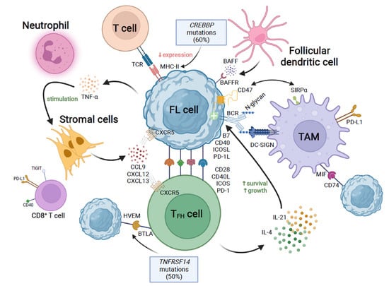 Schematic representation of the crosstalk between follicular lymphoma (FL) cells and the tumor microenvironment. From the upper right corner, clockwise: follicular dendritic cells secrete BAFF, which is sensed by BAFFR on FL cells. The “don’t eat me” signal CD47 expressed by FL cells interacts with SIRPα in tumor-associated macrophages (TAM), which induces immune tolerance towards tumor growth. N-glycan-modified residues of the B cell receptor (BCR) are recognized by DC-SIGN on the TAM. TFH cells secrete IL-4 and IL-21, which promote survival and growth of the FL cell. The immunological synapse is established, among others, between B7, CD40, ICOS, and PD-1L (FL cell) and CD28, CD40L, ICOS, and PD-1 (TFH cell). TNFRSF14 mutations affect the HVEM–BTLA interaction between FL and TFH cells. Stromal cells secrete chemokines, which are sensed by CXCR5 on FL cells. In turn, tumor cells release TNF-α, which stimulates stromal cells. Mutations in CREBBP induce a decreased MHC-II expression on FL cells, which reduce the interaction with the T cell receptor (TCR), thus hampering the detection of tumor cells by the immune system. Figure created with BioRender.com (accessed on 13 July 2022).