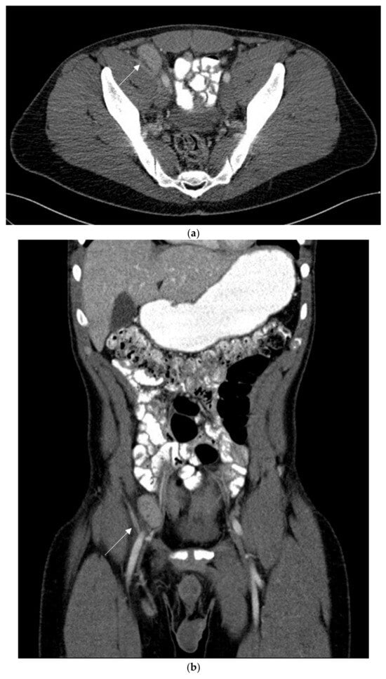 Given the slight spontaneous improvement of symptoms, and before performing the excisional biopsy of the large and suspected iliac lymph node, a fluorodeoxyglucose (FDG) PET-TC was scheduled and showed tracer accumulation at the level of lymphadenopathies (a standardized uptake value (SUV) of 12.4 for external iliac lymphadenopathies and 8.7 for right inguinal lymphadenopathies), confirming hypercellularity (Figure 4).