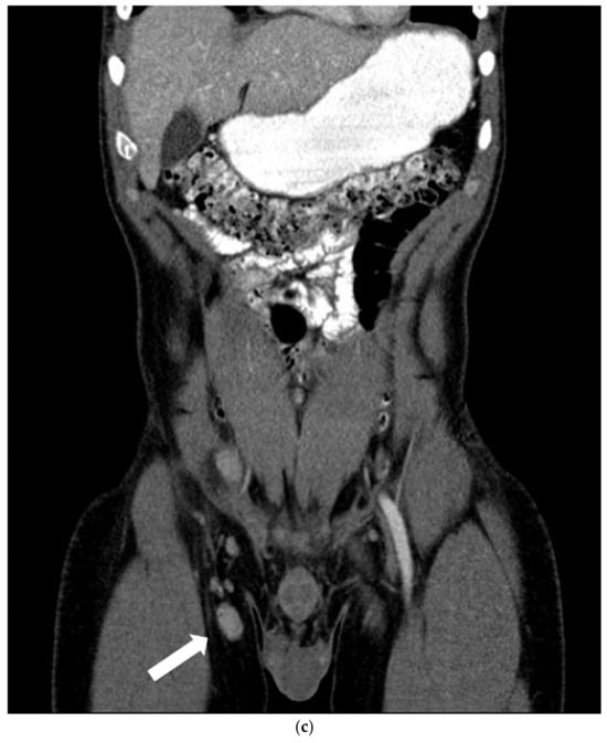 Contrast-enhanced computed tomography with axial (a) and coronal (b,c) reconstructions in the venous phase. (a,b) The thin arrow shows, both on the axial and coronal image, the hyper vascular right iliac lymphadenopathy. (c) The coronal image shows several right hyper vascular inguinal lymphadenopathies. The larger in size was selected for biopsy (thick arrow).