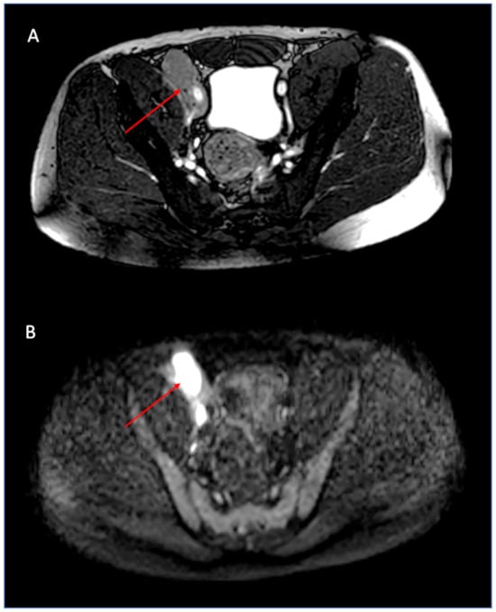Magnetic resonance imaging: the iliac lymphadenopathy (thin arrows) is clearly assessed on the axial balanced image (A). Diffusion-weighted imaging (DWI) shows a bright signal in the lymph node, suggesting hypercellularity or inflammation (B).