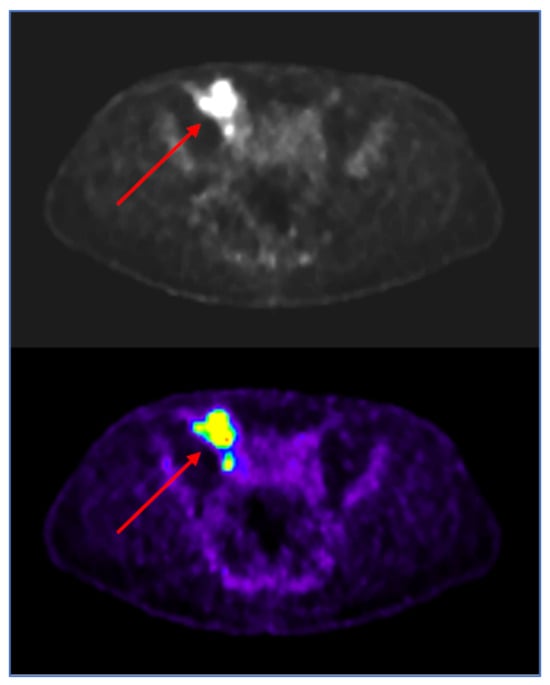 Fluorodeoxyglucose positron emission tomography (FDG-PET): Hypermetabolic iliac lymph node (red arrows), with high SUV-max (12.4) suggestive of inflammation or hypercellular tissue, in perfect agreement with the MR DWI image (3B).