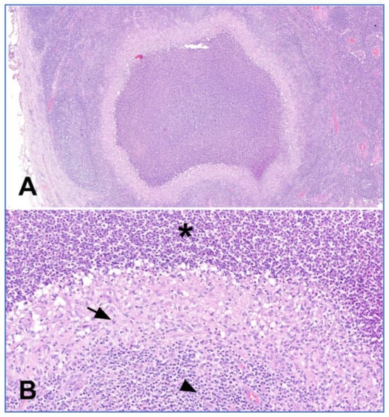 Histologic features of cat-scratch disease. (A) Suppurative granuloma characterized by a central area of necrosis surrounded by palisading histiocytes and fibroblasts (haematoxylin-eosin, magnification 4×). (B) Higher magnification showing polymorphonuclear leukocytes (asterisk), palisading histiocytes (arrow) and lymphocytes (arrowhead) (haematoxylin-eosin, magnification 20×).