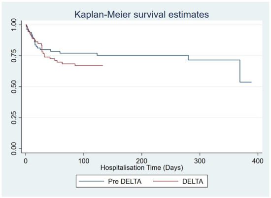 The Wilcoxon–Breslow–Gehan test showed a significant difference in the survival of patients, as measured by the outcome observed on day 30, between the delta and the pre-delta groups. (p value < 0.001). The Kaplan–Meir curves show that the survival of patients who were infected with the delta variant was worse when compared to the pre-delta group (Figure 1). The Kaplan–Meir curves also show shorter hospitalization lengths and faster deaths in the delta group compared to the pre-delta group. The median time to a final outcome in the pre-delta group was 162 days (IQR: 36266) compared to the 102 days (IQR: 32115) in the delta group.