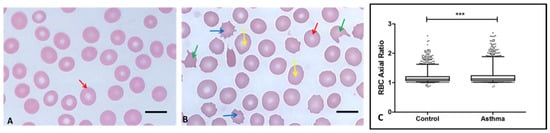 Light microscopy images of erythrocytes in (A) healthy controls and (B) experimental group (patients with asthma). Red arrow: normal discoidal cell; Blue arrow: echinocyte; Green arrow: acanthocyte; Yellow arrow: ovalocyte. Magnification: ×100, scale bar: 10 µm. (C) A comparison of erythrocyte axial ratios between controls and asthma patients. Data is represented as a dot plot with the mean and standard error of the mean. *** p < 0.0001, Mann-Whitney U Test.