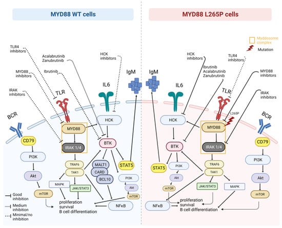 MYD88WT therapeutic challenges. Representation of the MYD88L265P-mutated and MYD88WT cells and related pathways that can be targeted by specific drugs (created with BioRender.com, accessed on 7 August 2023).