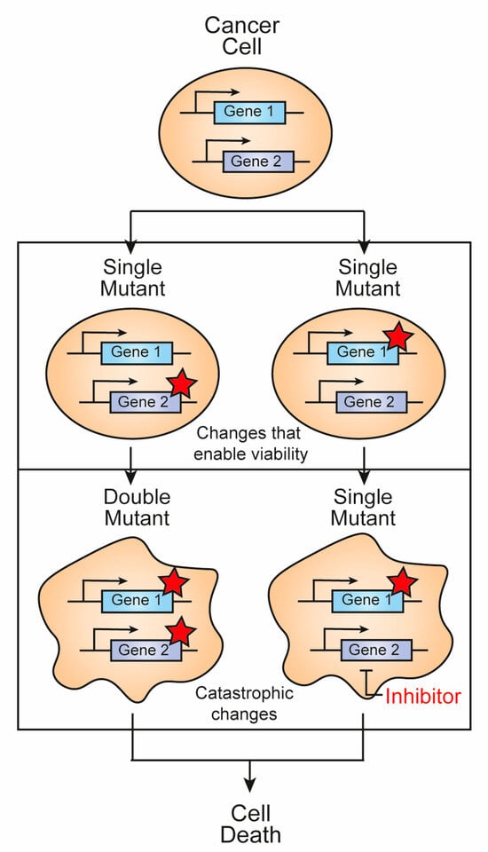 Notably, the high incidence of relapses (in children it is around 10%, while in adults it is close to 50%) after initial treatments represents a major challenge, constituting the main cause of mortality in pediatric patients diagnosed with ALL []. Indeed, this problem persists despite notable advances such as the introduction of multidrug chemotherapy regimens, allogeneic hematopoietic stem cell transplantation (HSCT) and the recent integration of CD19-targeted chimeric antigen receptor (CAR) T-cell immunotherapy [,]. Given its relevance, there is an inherent need to evolve and improve ALL treatment strategies by considering new and innovative approaches. In this regard, synthetic lethality has emerged as a promising therapeutic avenue against ALL and other cancers. A synthetic lethality interaction develops between two genes when alteration of only one allows survival, but simultaneous alteration of both causes loss of viability (Figure 1) []. With this goal in mind, the present review aims to showcase the synthetic lethality approaches described for the treatment of ALL, while explaining the intricate molecular mechanisms underlying these strategies. In addition, the review explores potential targets that have so far escaped scrutiny, offering a reasoned justification for their importance in this particular context.