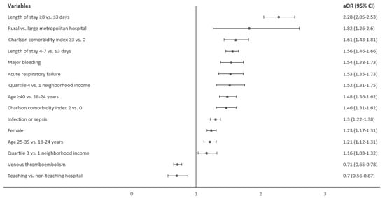 After adjusting for confounders, older age groups (age ≥ 40 years and 25–39 years) compared to 18–24-year-olds (aOR 1.48; 95% CI 1.36–1.62 and aOR 1.21; 95% CI 1.12–1.31, respectively), female sex (aOR 1.23; 95% CI 1.17–1.31), highest community-level income (aOR 1.52; 95% CI 1.31–1.75), admission to rural hospital vs. large metropolitan hospital (aOR 1.82; 95% CI 1.26–2.6), length of stay 4–7 vs. ≤3 days (aOR 1.56; 95% CI 1.46–1.66) and length of stay ≥ 8 vs. ≤3 days (aOR 2.28; 95% CI 2.05–2.53) were found to be associated with higher odds of RBC transfusion. Admission to a teaching hospital was associated with lower RBC transfusion odds (aOR 0.70; 95% CI 0.56–0.87) (Figure 1).