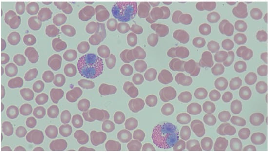 - Haseyama, Y.; Takeda, Y.; Kumano, K. Chronic myeloid leukemia presenting with marked eosinophilia. Rinsho Ketsueki. 2018, 59, 2594–2599. [Google Scholar] [PubMed]