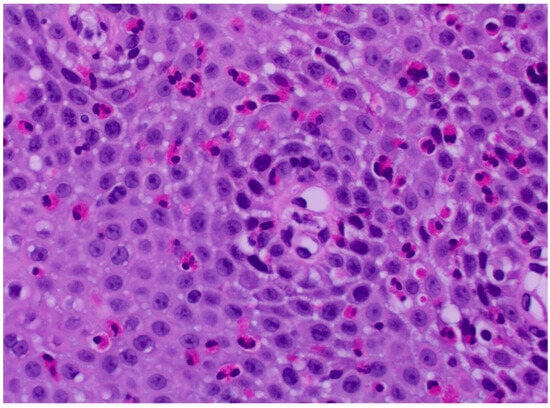 - Kalejaiye, O.O.; Amaeshi, L.C.; Banjoko, O.O. Unusual Case of Hypereosinophilia in Hodgkin Lymphoma in a Nigerian Woman. AIM Clin. Cases 2024, 3, e230012. [Google Scholar] [CrossRef]