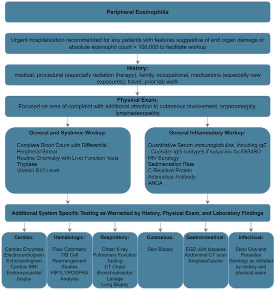 - Curtis, C.; Ogbogu, P.U. Evaluation and Differential Diagnosis of Persistent Marked Eosinophilia. Immunol. Allergy Clin. N. Am. 2015, 35, 387–402. [Google Scholar] [CrossRef] [PubMed]