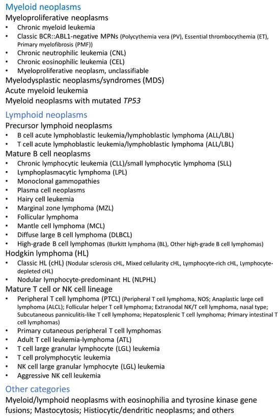 The current classification of hematopoietic neoplasms integrates data from several sources, including histological features, immunophenotype, molecular pathology, and clinical features []. Therefore, there is a consensus between pathologists, hematologists, oncologists, geneticists, and bioinformaticians [,,,]. The classification can be divided into myeloid neoplasms, lymphoid neoplasms, and other categories, such as mastocytosis and histiocytic/dendritic neoplasms [,].