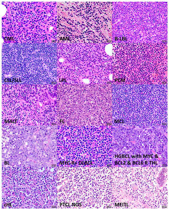 Histological images of lymphoma subtypes (Hematoxylin and Eosin staining; original magnification 400×). Chronic myeloid leukemia (CML), acute myeloid leukemia (AML), B lymphoblastic lymphoma (B-LBL), chronic lymphocytic leukemia/small lymphocytic lymphoma (CLL/SLL), lymphoplasmacytic lymphoma (LPL), plasma cell myeloma (PCM), mucosa-associated lymphoid tissue (MALT) lymphoma, follicular lymphoma (FL), mantle cell lymphoma (MCL), Burkitt lymphoma (BL), diffuse large B-cell lymphoma (DLBCL) with MYC rearrangement (MYC-R+), high-grade B-cell lymphoma with MYC, BCL2, and BCL6 rearrangement (triple-hit lymphoma (THL)), classical Hodgkin lymphoma (cHL), peripheral T-cell lymphoma (PTCL), not otherwise specified (NOS), and monomorphic epitheliotropic intestinal T-cell lymphoma (MEITL).