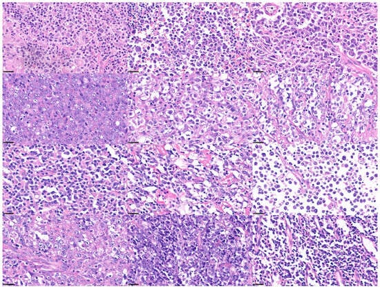 Lymphoid neoplasms originate from B lymphocytes and T lymphocytes. They include precursor B- and T-cell lymphoid neoplasms (acute lymphoblastic leukemia/lymphoma), mature B-cell neoplasms, such as chronic lymphocytic leukemia, follicular lymphoma, diffuse large B-cell lymphoma, and multiple myeloma; mature T or natural killer (NK) cell neoplasms, such as peripheral T-cell lymphoma (PTCL); and Hodgkin lymphoma. Hodgkin lymphoma is characterized by a mixed inflammatory cell background that includes a minority of neoplastic cells, known as Reed–Sternberg cells, and their variants, which are derived from germinal or post-germinal centers [,]. Figure 1 and Figure 2 show a summarized version of the classification of hematopoietic neoplasms and characteristic histological images.