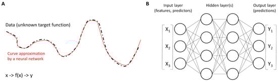 Artificial neural networks have the ability of function approximation and build their own functions to approximate physiological conditions and disease models. Functions are “input-output machines”, in which an input set of numbers (i.e., predictors, “x”) is taken, and the output (create) is a corresponding set of numbers (“y”). The function [f(x)] defines the relationship between these numbers [(x -> f(x) -> y)] []. Neural networks are used when the definition of the functions that we are trying to approximate is unknown and only the dataset points of inputs and outputs are known. Curve fitting approximates a function that fits the data points, making it possible to accurately predict outputs given inputs that are not in the dataset [,,]. Therefore, neural networks (NNs) work as a universal function approximator for different curves of datasets []. In other words, a network itself is a function that approximates an unknown target function [f(x) ≈ NN(x)].