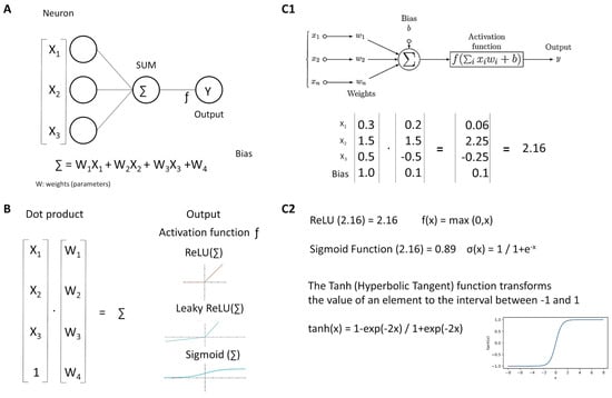 Neurons take many inputs (X) but only produce one output (Y). Each input is multiplied by its own weight (W), and in the equation, one extra weight known as bias is added (W4) [=W1X1 + W2X2 + W3X3 + W4 (Bias)] (Figure 6A). This weighted sum can be rewritten using linear algebra (Figure 6B). The inputs are included in a vector with an extra one for the bias. The weights are included in another vector. Figure 6(C1) shows an example of the dot product. After addition, the product is passed to an activation function to add nonlinearity to the neural network, such as ReLU. There are other types of activation functions, such as Leaky ReLU and sigmoid (Figure 6(C2)). In a neural network, the output vector is successively fed as inputs to the next layer until the final output. The point is that each neuron is responsible for learning a small piece or feature of the overall function, and a complicated function can be built by combining many neurons. Interestingly, with an infinite number of neurons, any function could be built. During the training of the network, the values of the weights (parameters) are determined. The aim of the training is to minimize the network’s error (loss), which is a measurement of the difference between the predicted outputs and the real (true) outputs. With time, the loss decreases. The backpropagation algorithm is used to achieve this optimization. Gradient descent is an optimization algorithm that is commonly used to train machine learning models and neural networks. The network improves its predictions until one or more of the stopping criteria are met.