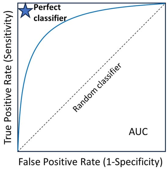 Receiver operating characteristic (ROC) curve. The area under the curve (AUC) ranges from 0 to 1, and larger AUC values indicate better performance. An AUC of 0.5 indicates no discriminative power. The “blue star” indicates the position of the AUC of 1.0.
