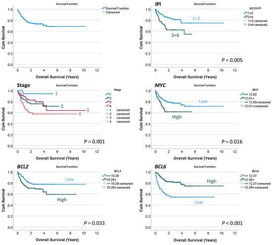 Overall survival analysis. This study used a conventional series of diffuse large B-cell lymphoma (DLBCL), as shown by the International Prognostic Index (IPI) and clinical stage that stratified patients according to survival. By gene expression, high MYC and BCL2 levels were associated with poor overall survival. Conversely, high BCL6 levels were associated with a favorable outcome.