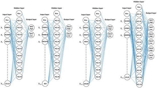A feedforward neural network was used to predict MYC, BCL2, and BCL6 expression using a pan-cancer panel of 758 genes for immuno-oncology and translational research that includes clinically relevant actionable genes and pathways. The characteristics and parameters of the different neural networks are detailed in Table 5. The network performance was realistic and between 70% and 90% accuracy. The performance for the prediction of BCL2 was moderate, with an area under the curve (AUC) of 0.783 and an accuracy of 73.4% for the training and 63.3% for the testing set. The performances of MYC and BCL6 were higher, with AUCs of 0.925 and 0.939, respectively. The accuracies for MYC were 86.3% (training) and 88.9% (testing). The accuracies for BCL6 were 88.2% (training) and 86.1% (testing). The first ten most relevant genes for the prediction of the marker, based on the sensitivity analysis, are also shown (Table 5, Table 6, Table 7 and Table 8, Figure 9 and Figure 10).