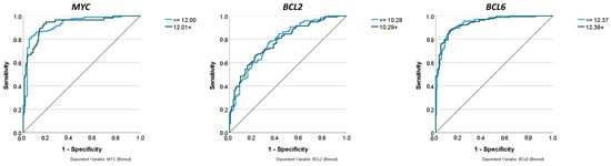 Comparison of performance using receiver operating characteristic (ROC) curves. The neural networks predicted the gene expression of MYC, BCL2, and BCL6 as binary variables (high vs. low). The predictors were 758 genes of a pan-cancer panel of immuno-oncology and translational research that includes clinically relevant actionable genes and pathways. The areas under the ROC curves were 0.925, 0.783, and 0.939, respectively.