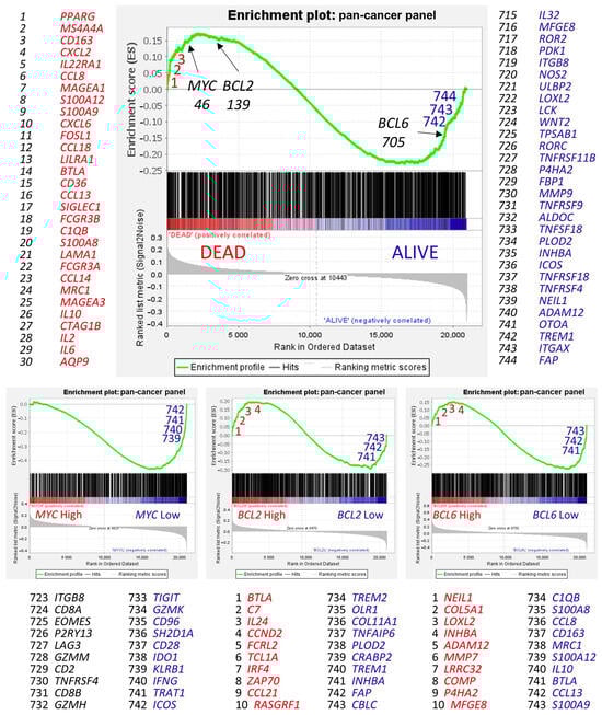 Gene set enrichment analysis (GSEA). Gene set enrichment analysis (GSEA) is a computational method that determines whether an a priori defined set of genes shows statistically significant, concordant differences between two biological states (e.g., phenotypes) [,,]. GSEA was performed using (i.e., the priori-defined set of genes) the 758 genes of the pan-cancer panel of immuno-oncology and translational research as predictors, which includes clinically relevant actionable genes and pathways. The predicted variables (i.e., phenotypes) were the overall survival outcome, such as dead vs. alive, and the MYC, BCL2, and BCL6 expression (high vs. low groups, the same as the neural networks). In the GSEA, the genes are ranked based on their rank metric score and running enrichment score (ES). The ES reflects the degree to which a gene set is overrepresented at the top or bottom of a ranked list of genes [,,], for example, the gene expression profile of patients who died.