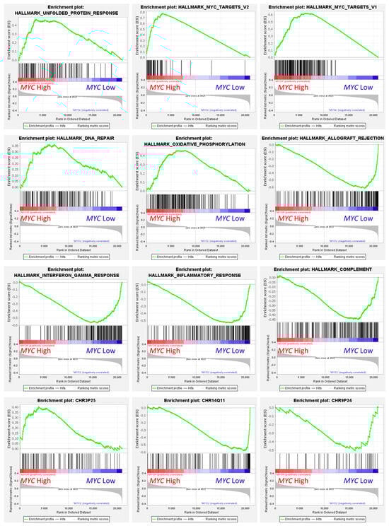 Gene set enrichment analysis (GSEA) on MYC expression groups. GSEA analysis was performed using as predictors several gene sets of the Molecular signatures database (MSigDB), including hallmark (H), positional (C1), and curated (C2) gene sets. The predicted variable (phenotype) was the MYC expression (high vs. low groups), the same as the neural networks. This figure shows some of the most relevant GSEA plots. High MYC expression correlated with high expression of genes associated with protein response, MYC targets, DNA repair, oxidative phosphorylation pathways, and chromosome 3p25 locus-associated genes. Low MYC expression correlated with allograft rejection, interferon gamma response, inflammatory response, complement, and chromosome 1q11 and 8p24.