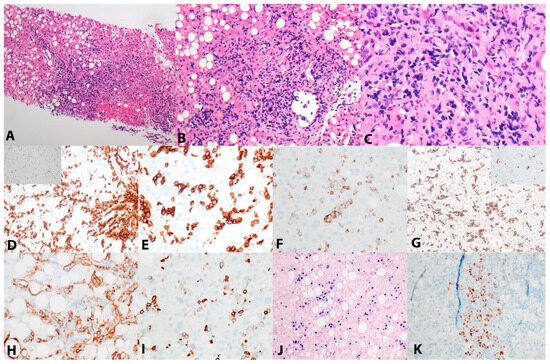 Nine months following the initial presentation, she was admitted yet again with fever, night sweats, tachycardia, and bilateral pedal edema, which subsequently advanced to anasarca. Comprehensive evaluation revealed no indications of congestive heart failure, nephrotic syndrome, or cirrhosis. Laboratory investigations upon admission revealed anemia (hemoglobin: 92 g/L, WBC: 5.0 × 109/L, and platelet count: 174 × 109/L), along with elevated liver enzymes (AST 143 U/L, ALT 273 U/L, ALP 672 U/L, and bilirubin 74 µmol/L), low albumin (25 g/L), and normal INR (0.9) and creatinine (38 µmol/L). High-level EBV viremia was detected (EBV PCR on peripheral blood 4.41 × 107 IU/mL) with positive viral capsid antigen (VCA) IgG and Epstein-Barr nuclear antigen (EBNA) IgG and negative VCA IgM, indicative of a late-stage infection. HBV DNA was, however, undetectable at this juncture. Testing for other viral pathogens, including HIV, Delta virus, COVID-19, respiratory swab pathogens, and human T-cell lymphotropic virus (HTLV-1/2), returned negative results. A comprehensive timeline of all of the available laboratory data can be found in Supplementary Table S1. Notably, the criteria for HLH were not met. Imaging via CT abdomen revealed marked hepatomegaly and moderate splenomegaly, without significantly enlarged abdominal or pelvic lymph nodes or signs of cirrhosis. CT brain and neck scans yielded unremarkable findings. Additionally, a positron emission tomography (PET) scan demonstrated no definitive evidence of fluorodeoxyglucose (FDG)-avid nodal or extranodal sites suggestive of a lymphoproliferative disorder. Subsequently, the patient underwent liver biopsy and bone marrow examination.