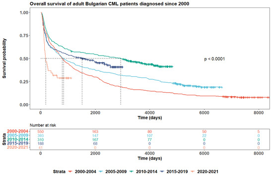 Overall survival of patients with CML registered in the Bulgarian National Cancer Registry (BNCR) during five distinct periods: 2000–2004; 2005–2009; 2010–2014; 2015–2019; and 2020–2021. p-value is from log-rank test.