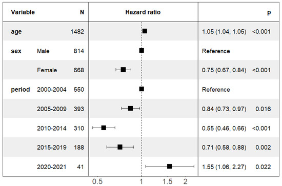 As shown in Figure 1, the OS differed significantly over the study periods (log-rank test p-value < 0.0001). The median OS was 783, 838, 2933, 1510, and 179 days for periods 2000–2004, 2005–2010, 2010–2014, 2015–2019, and 2020–2021, respectively (Figure 1). Notably, OS seemed to increase constantly over the first three time periods until 2014 but worsened during the period 2015–2019 in comparison to 2010–2014 (log-rank test p-value = 0.032) and was worst for the last two years 2020–2021 (log-rank test p-value = 0.0006 vs. baseline period 2000–2004) (Figure 1). These findings were independent of age and sex as confirmed by the multivariate Cox model (Figure 2).