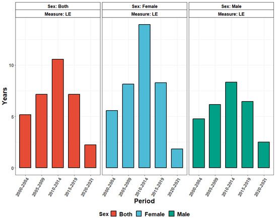 Estimated life expectancy (LE) for males, females, and both sexes over the five periods.