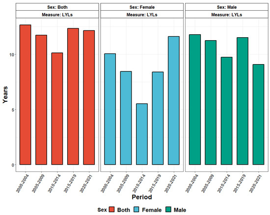 Life years lost (LYLs) for males, females, and both sexes over the five periods.