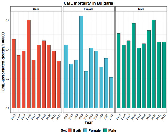 Annual rate of deaths due to CML reported in the general Bulgarian population between 2013 and 2022. The rate is estimated for males, females, and both sexes per 100,000 people.