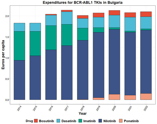 Absolute NHIF expenditures for the following TKIs: imatinib, nilotinib, dasatinib, bosutinib, and ponatinib were obtained as annual absolute values in Bulgarian levs (BGN). They were converted to EUR using the fixed exchange rate of BGN 1.958 for 1 EUR and normalized to the annualized population size so that the data could be provided as EUR spent per capita in each year between 2014 and 2022. The data were presented as stacked barplots using the ggplot2 v. 3.5.1 package.