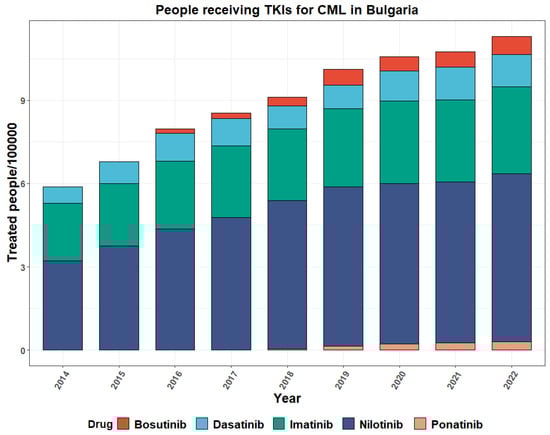 Analogously, the NHIF provided data regarding the total number of patients with CML who have received at least a single dose of any of the above-listed TKIs during the period between 2014 and 2022. Notably, some patients might have received more than one TKI during that period and been included in several of the aggregate counts. The counts of patients who have received TKIs were normalized to the annualized general population size. Data were presented as stacked barplots of the number of patients who had been treated with any TKI per 100,000 people.