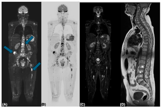 Figure shows the most representative sequence of the 1.5 T whole-body MRI. (A) A coronal reconstruction of diffusion-weighted imaging (DWI) with restricted diffusion of the bone lesion (blue arrows) at high b-values; (B) Image represents a high b-value DWI with inverted grey-scale PET-like reconstruction of the bone lesions. (C) A coronal short tau inversion recovery (STIR) that enhances bone substitution with a hyperintense signal compared to the adjacent fatty bone marrow. (D) Image represents a sagittal turbo-spin-echo (TSE) sequence where the bone lesions appear as focal hypointense alterations (asterisks).