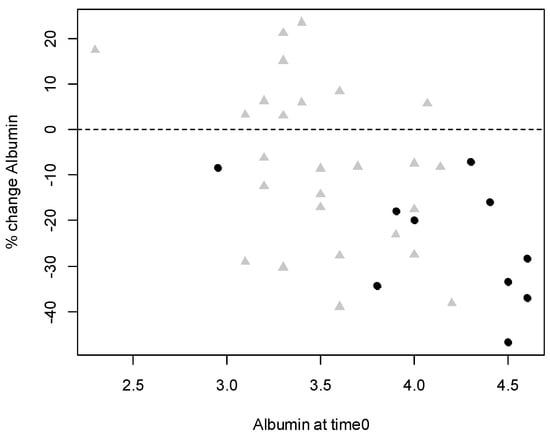 Scatterplot of albumin levels at time 0 and relative change. Black dots refer to patients who presented venous thromboembolism and grey triangles refer to patients who did not.