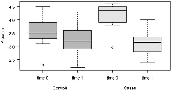 Boxplots of albumin levels for cases and controls, at time point 0 (before any treatment) and time point 1 (event).