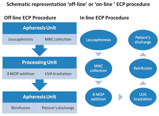 In the “off-line” method, all the phases of ECP (leukapheresis, photoactivation, and reinfusion) are achieved sequentially using separate equipment: A cell separator performs leukapheresis for mononuclear cell collection using a sterile disposable kit. Red blood cells and plasma are returned to the patient. Using a laminar flow cabinet, the MNC bag must be transferred to an appropriate special bag to which 8-MOP is added. After UVA irradiation, the collected cells are reinfused into the patient using a standard transfusion filter [10,11]. In the “in-line” method, all the phases of ECP (leukapheresis, photoactivation, and reinfusion) are performed sequentially in extracorporeal circulation using a single instrument and a single sterile disposable kit without disconnection from the patient’s blood circulation. The cell separator collects the peripheral blood mononuclear cells, while the red blood cells and plasma are returned to the patient. The MNCs are collected in a bag, 8-MPO is added, and then it is exposed to UVA. After the irradiation treatment, the MNC concentrate is reinfused back into the patient [12,13]. A schematic pictorial comparison of the ECP methods performed with the off-line and in-line approaches is reported in Figure 1.
