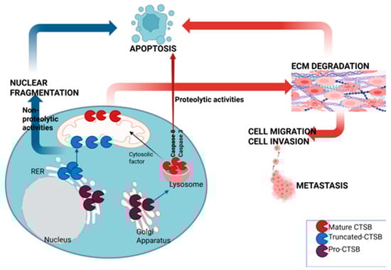 Among proteases, a large group of enzymes that catalyze the cleavage of peptide linkages in proteins, cathepsin B (CTSB) draws significant interest from researchers. CTSB (EC 3.4.22.1) is the first and currently the best-characterized member of the C1 family of papain-like, lysosomal cysteine peptidases [6]. Several lines of studies confirmed that in patients with B-cell lymphoma, the main source of CTSB in blood is likely to be tumor cells (malignant B cells) and immune cells associated with the tumor microenvironment, such as macrophages and monocytes [5,7]. Under normal physiological conditions, CTSB is primarily found in the acidic lysosomal compartment where it is essential for controlling various cellular functions such as tissue remodeling, protein degradation, regulation of pro-hormone and pro-enzyme activation, antigen processing, inflammatory responses and apoptosis [5]. On the other hand, the damaging of lysosome integrity and rupturing them by oxidative stress can affect the cathepsin subcellular location [8]. It may release the proteins into the cytosol where they can promote apoptosis, tumor invasion and metastasis (Figure 1).
