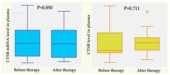 We investigated the correlation of CTSB with CTSB mRNA, redox biomarkers and Cys C levels before and after therapy. Prior to therapy, plasma CTSB protein levels showed no correlation with CTSB mRNA levels, redox parameters or Cys C. However, after therapy, a positive association was observed between plasma CTSB protein levels and CTSB mRNA levels. Additionally, the TOS exhibited a positive correlation, while TAS and Cys C showed a negative correlation with plasma CTSB protein levels. Moreover, a significant correlation was identified between CTSB levels measured before and after therapy (r = 0.577; p = 0.012). These findings are summarized in Table 3.