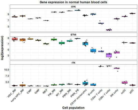 - Gíslason, M.H.; Demircan, G.S.; Prachar, M.; Furtwängler, B.; Schwaller, J.; Schoof, E.M.; Porse, B.T.; Rapin, N.; Bagger, F.O. BloodSpot 3.0: A database of gene and protein expression data in normal and malignant haematopoiesis. Nucleic Acids Res. 2024, 52, D1138–D1142. [Google Scholar]