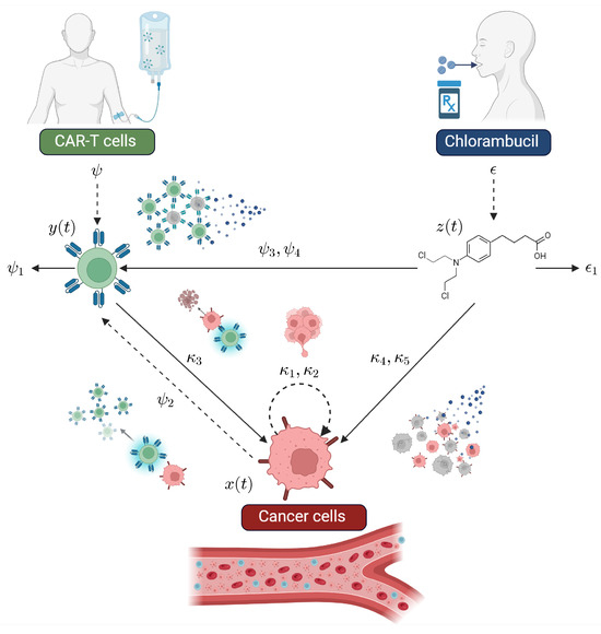 Schematic diagram of the CLL system illustrating all interactions described by Equations (1)–(3). The diagram includes the administered therapies, the cytotoxic effects of CAR-T cells and chlorambucil on leukemia cells, and the cross-cytotoxicity of the chemotherapy drug on effector cells. Additionally, it highlights the activation of CAR-T cells triggered by interactions with cancer cells and the self-stimulating growth of leukemia cells. Diagram created in BioRender: https://BioRender.com/s31e824 (created on 10 January 2025, under the agreement number IN27RXDGP6).