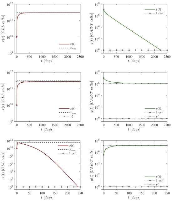 Clinically significant biological behavior. All solutions for the CLL cells, , and CAR-T cells, , will exhibit biologically meaningful dynamics if their populations persist above the value of one cell. Otherwise, one can assume complete eradication. Hence,