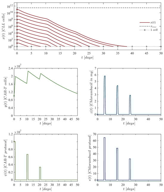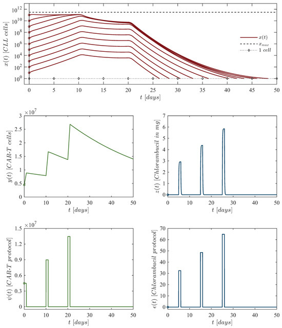 These remarks are helpful in drawing conclusions from the in silico experimentation results. First, it is essential to recognize that, with positive initial conditions, representing biologically feasible cell and drug concentrations, all solutions will remain within the nonnegative orthant . Additionally, Remark 2 offers a practical threshold to assess cell eradication, emphasizing the interplay between nonlinear systems theory and oncology in the context of a mathematical model describing the combined application of chemotherapy and immunotherapy treatments.