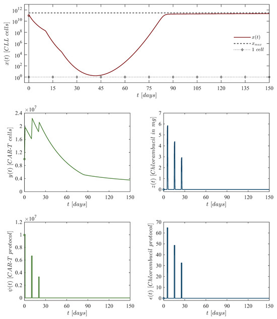 Now, let us describe the system as follows. Equation (1) models the dynamics of CLL cells under the combined treatment of chemoimmunotherapy. The first term describes the development of leukemia cells using a logistic growth law (see Section 4.3 in [15]), which implies a growth rate and a maximum carrying capacity. The second term represents the overall immune response of CAR-T cells against the leukemia cells based on the law of mass action (see Section 2.3 in [16]). The third term accounts for the chemotherapy effect through a pharmacodynamics of maximum response [17]. In the scope of our model, CAR-T cell immunotherapy is considered as the primary treatment strategy; hence, we assume an eradication of cancer cells that follows the log-kill hypothesis [18], i.e., each consecutive application of the treatment should eradicate a fraction of leukemia cells regardless of its total concentration. Chlorambucil drug is used as a secondary treatment; therefore, its cytotoxicity on the leukemia cells is modeled by the Michaelis–Menten kinetics [19]. Equation (2) models the overall behavior of CAR-T cells . The first term accounts for the external application of the effector cells, while the second term captures their natural death. The third term describes the activation and proliferation of CAR-T cells upon interaction with leukemia cells in the bloodstream. The fourth term reflects the cytotoxic effect of the chlorambucil drug on CAR-T cells when both therapies are administered into the system at simultaneous periods of time. Equation (3) models the pharmacokinetics of chlorambucil as a first-order process, measured in milligrams. The first term represents the external administration of the chemotherapy, while the second term accounts for its natural decay over time [20]. The schematic representation of the system is illustrated in Figure 1.